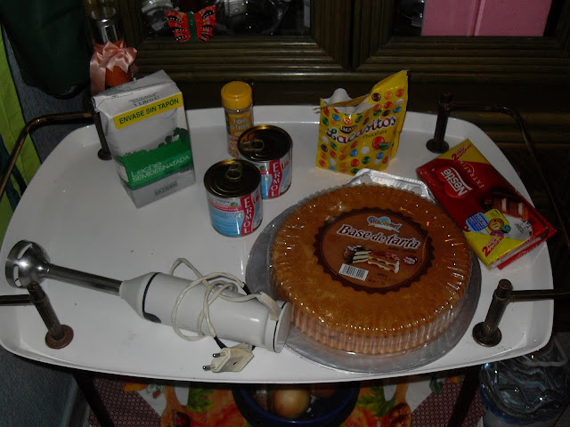 A ver, nuestra idea era hacer una tarta de: chocolate, nata y dulce de leche, adornada con lacasitos y fideos de azúcar espacial. Sin embargo, el malévolo doctor maligno fraguó nuestros planes. Os explicaré lo que ocurrió esa fría noche del 15 de noviembre de 2011: pusimos el chocolate a hervir (300gr) en medio vaso de leche y... ¡tachán! se deshizo y desapareció, convirtiéndose en chocolate para beber. Lo hervimos y no cogió forma. Se nos había olvidado el ingrediente secreto para dotar de músculos al chocolate y poder convertirlo en una masa espectacular de rellenos para tartas. Así que nos quedamos sin chocolate. Ahí empezó a cundir el pánico. ¡Nos íbamos a quedar sin tarta de aniversario!