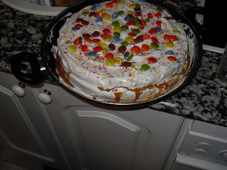 En conclusión, la tarta quedó pobre de base, pero exuberante en la copa. Los chorros de dulce de leche se derramaban por no tener sitio en donde descansar, y la nata de la capa superior era un dedo de gorda. Finalmente pusimos los lacasitos (algunos se perdieron por el camino y ya no digo nada más...) y los fideos de colores, adornando la masa blanca lechosa de nieve dulce. El resultado, este que podéis ver: